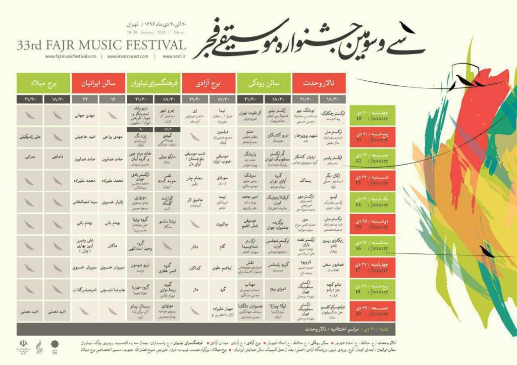 رسانه نوا – جدول اجراهای سی وسومین جشنواره موسیقی فجر اعلام منتشر شد و بلیت فروشی از فردا (چهارشنبه) آغاز میشود.
